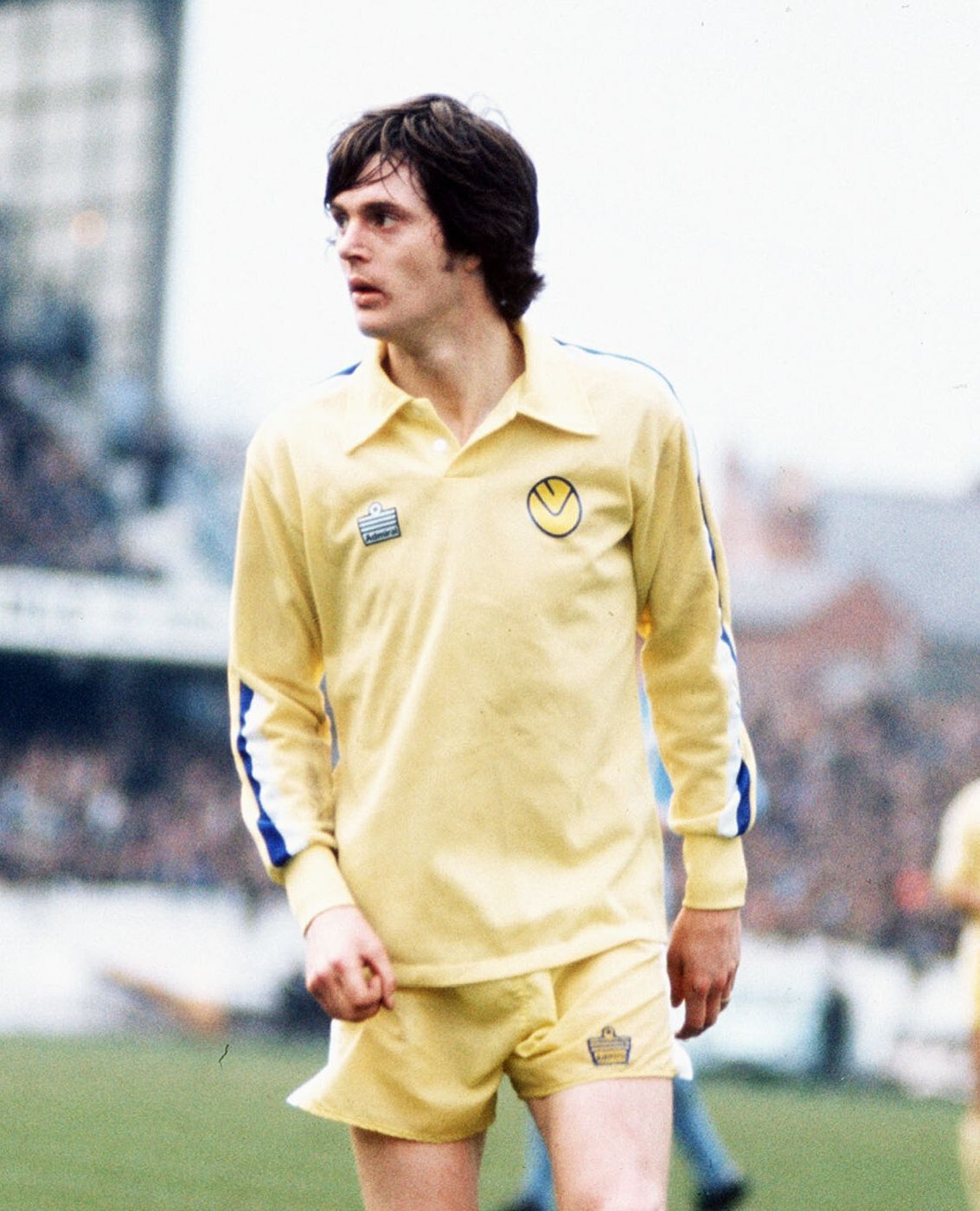 Yellow long-sleeve Airtex with blue and white stripes on the arms and the smiley badge. About 1974. There’s a great photo of our former manager Neil Redfearn wearing one as a kid. I hope one day my dad can find a photo of me in mine.